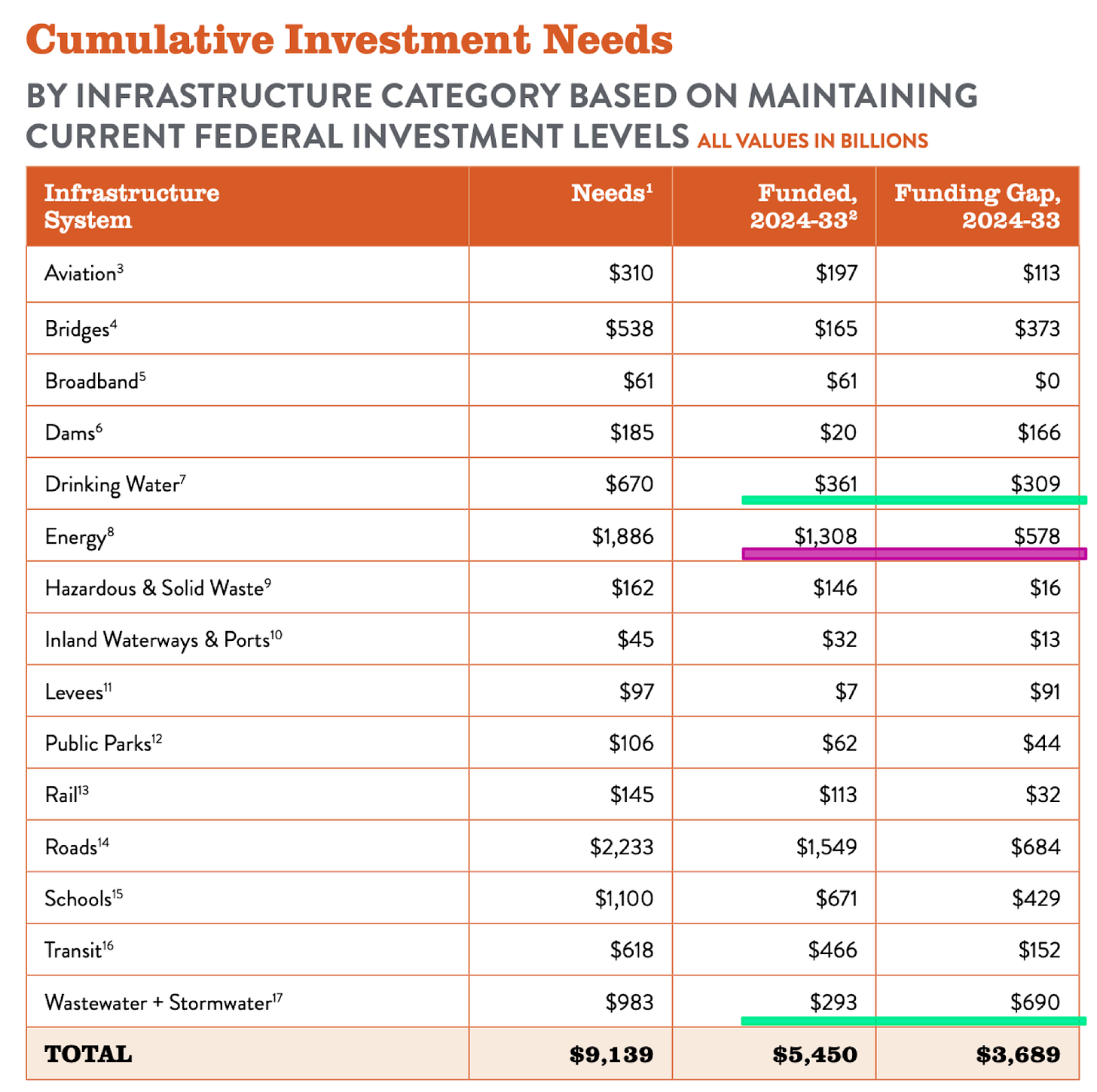 Despite being just as foundational to modern life, water infrastructure attracts a fraction of the attention and investment. The global funding gap is estimated to reach $7 trillion by 2030 (World Bank), with $900 billion required in the U.S. alone, as shown in the table below.