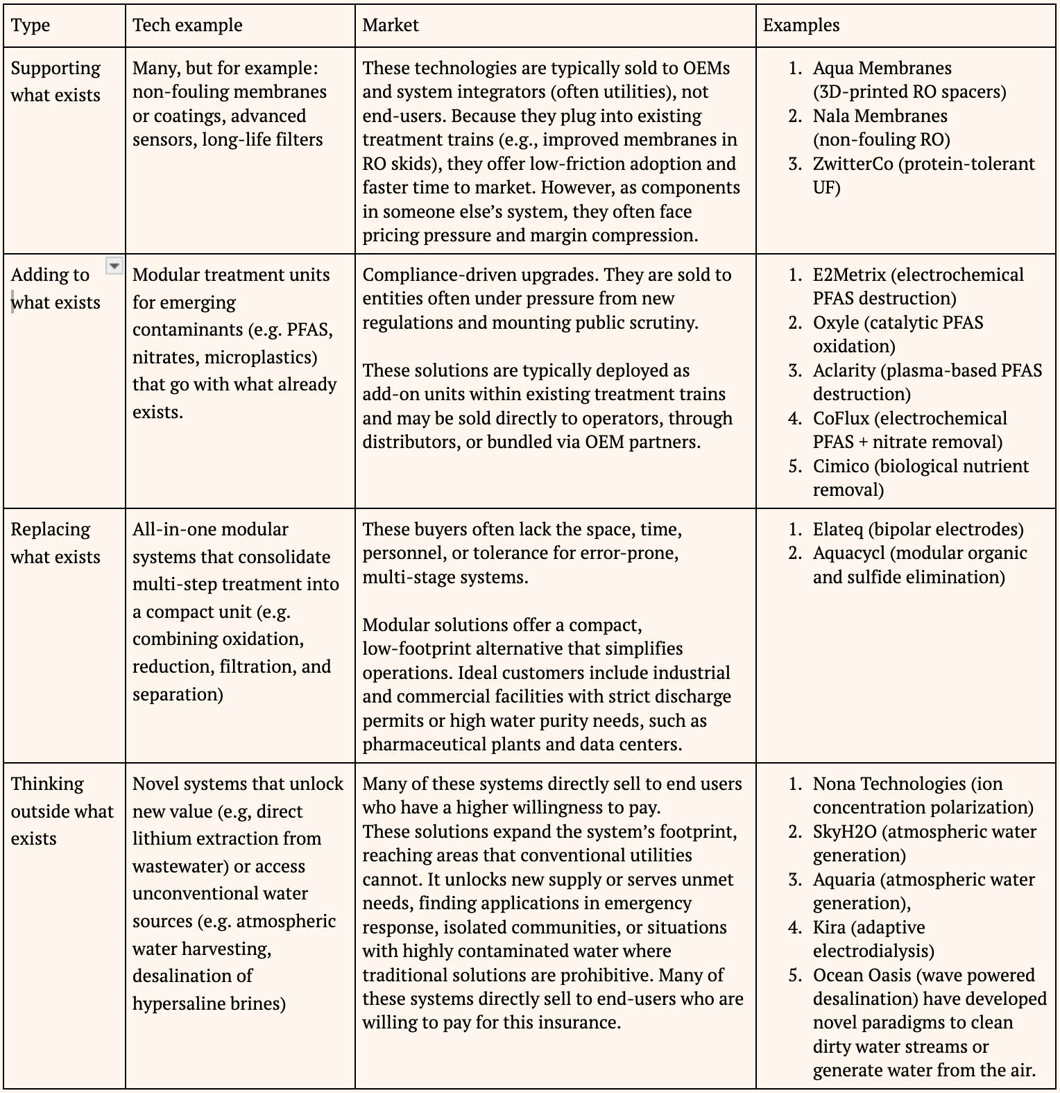 We will continue to explore all of these areas, but we are particularly interested in the middle two: “adding to what exists” and “replacing what exists.” These approaches balance ambition with feasibility. They address urgent needs (like PFAS destruction or high-purity reuse). They unlock new access. They can be adopted without overhauling entire systems, creating paths for near-term impact and faster commercialization.