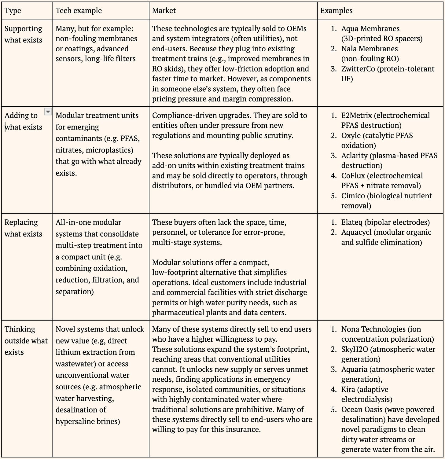 You need to be critical for the market to care, but not so critical that it feels paralyzed by the risk of disruption. Innovation is also constrained by the nature of water itself: as a life-critical system, it demands high reliability and has zero tolerance for failure. You can’t A/B test a treatment system the way you might a battery or a vehicle. That makes buyers, especially utilities, extremely risk-averse and leaves little room for experimental technologies to scale without years of validation.