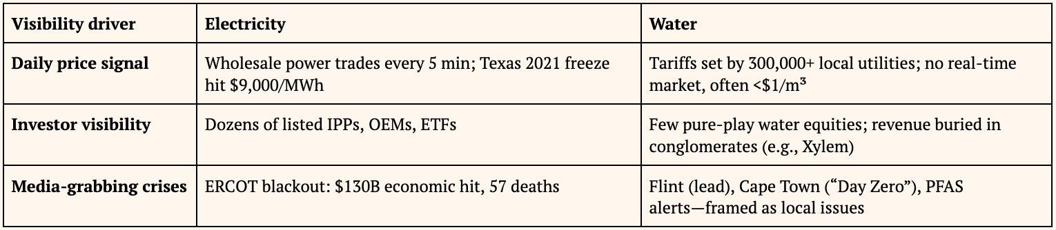 Why does electricity dominate headlines and capital flows, while water, arguably more essential, remains overlooked?